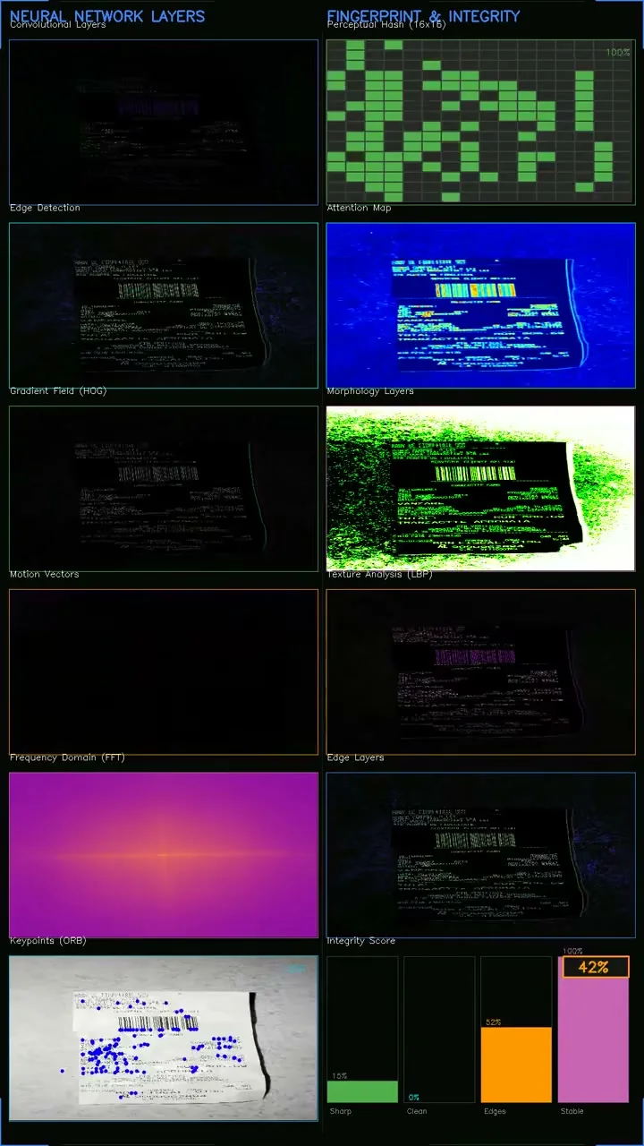 Compute a unique fingerprint from fiscal identifiers + timestamp + total. Check against global database. Run integrity heuristics to detect image manipulation.